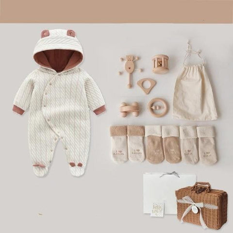 Your little bundle of joy deserves the best. This is a gift that is not just adorable but it's also organic that is very suitable and best for babies. The beautiful new baby gift collection would make the perfect gift for baby shower surprises. It has two sets you can choose from. Each set includes a onesies jumpsuit, wood toys, and socks. It is packed in a beautifully crafted rattan suitcase that you will really adore.